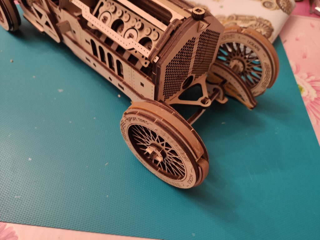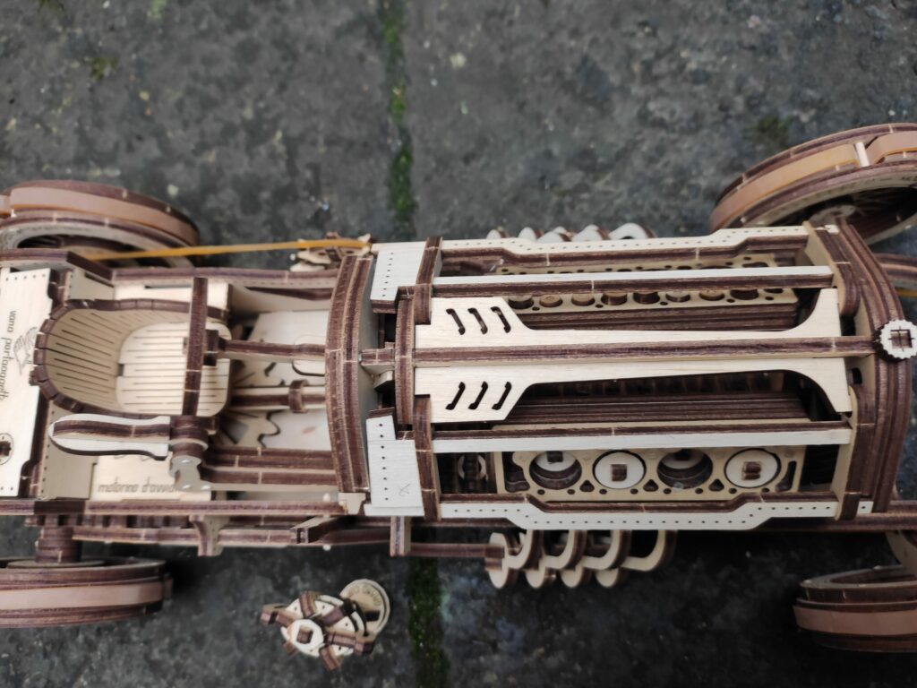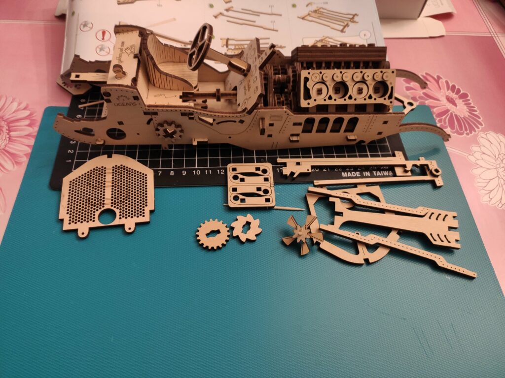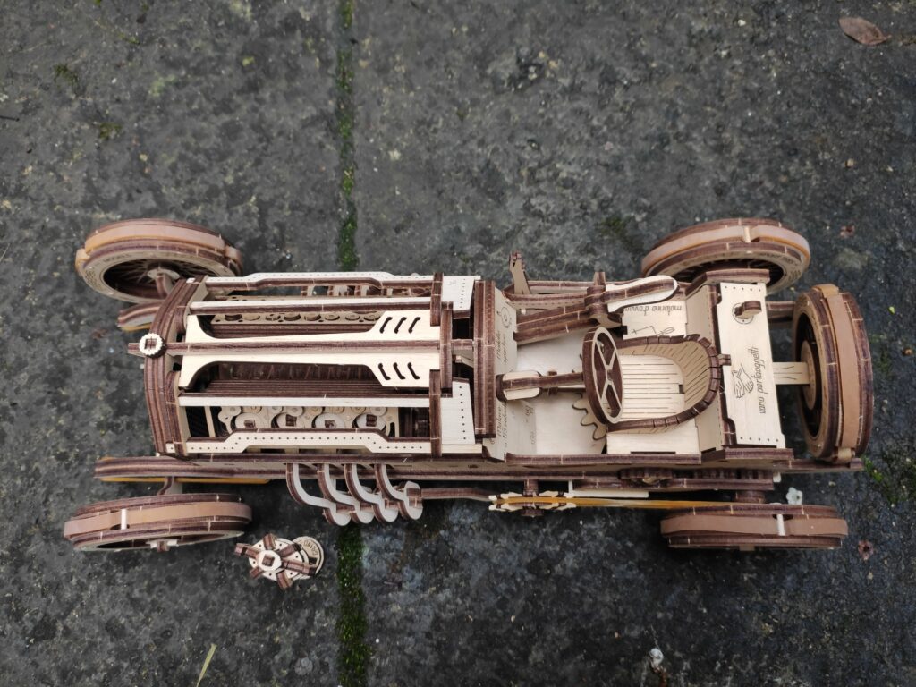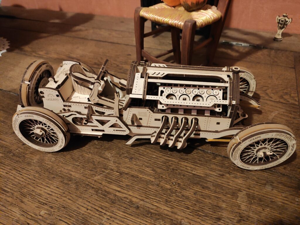 une petite auto en bois pour finir l’année, dans le descriptif c’est indiqué « à partir de huit ans » je doute qu’un enfant puisse la réaliser tout seul sans l’aide d’un adulte, bon apres tout …., le montage n’est pas compliqué mais reclame beaucoup de soins et de patience , contrairement aux modèle de chez Ugears celui-ci à besoin d’un peu de colle.