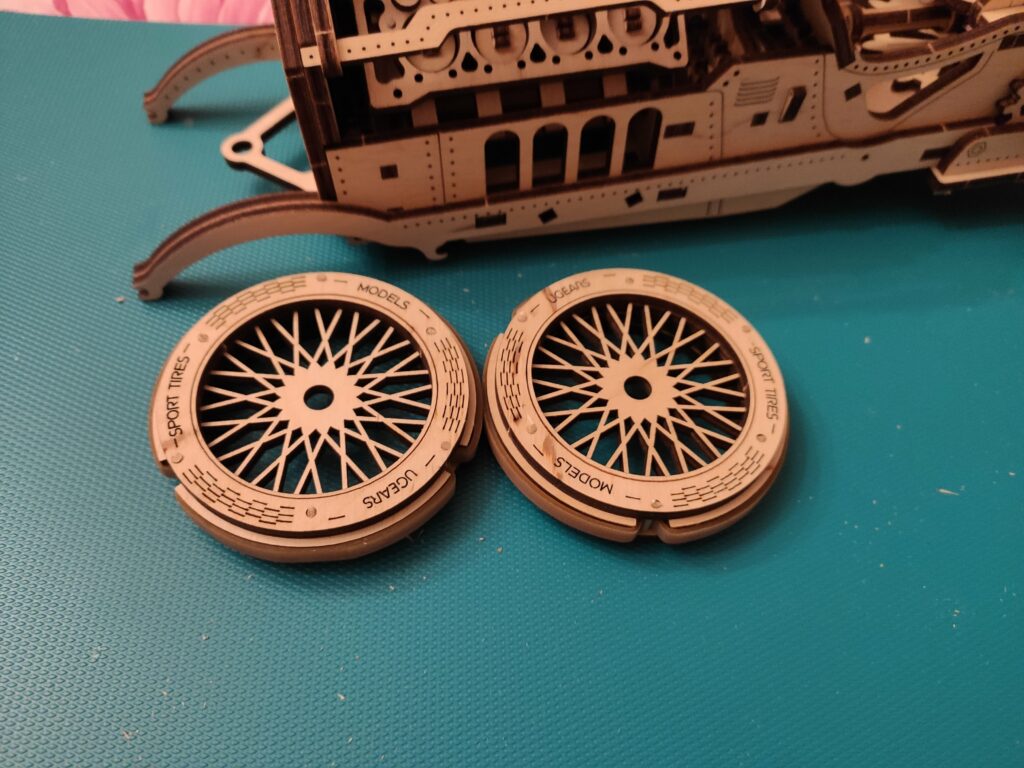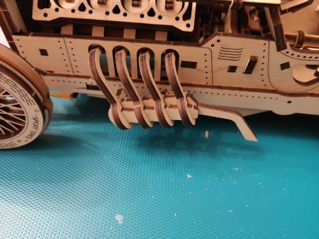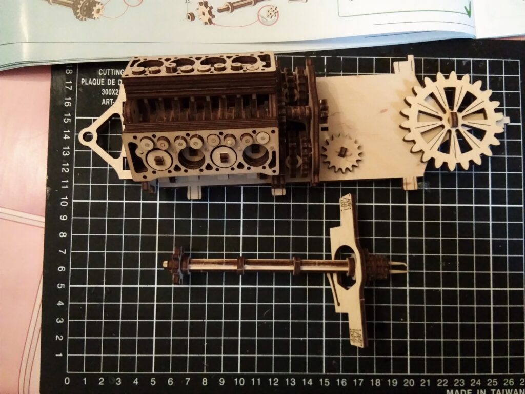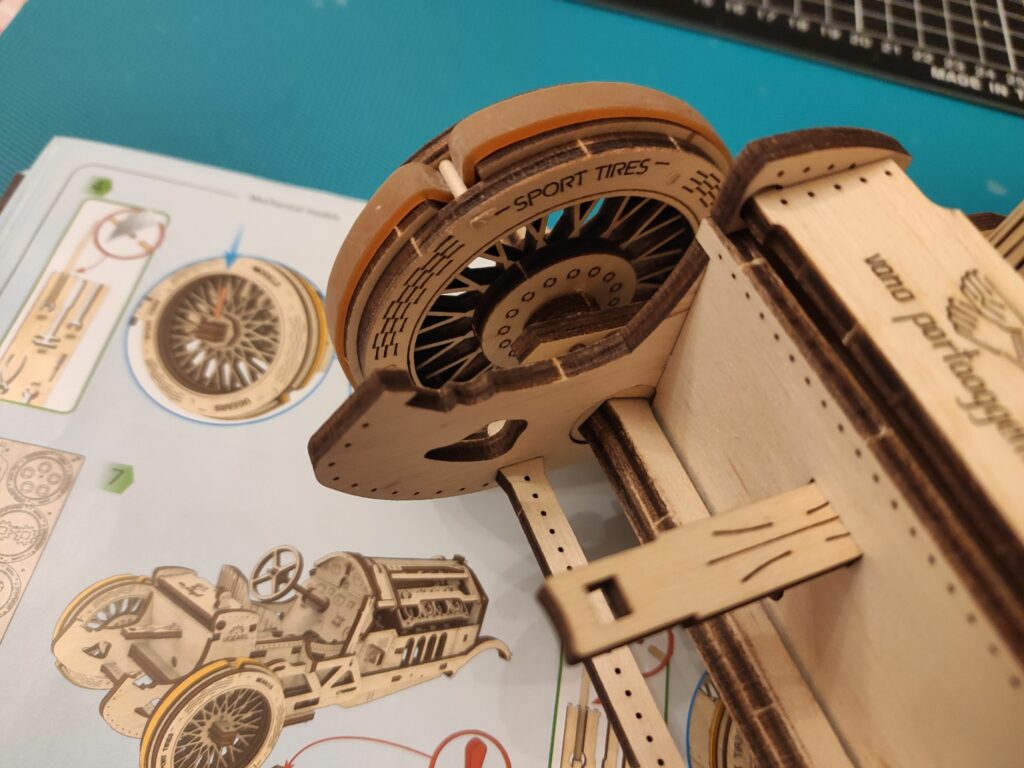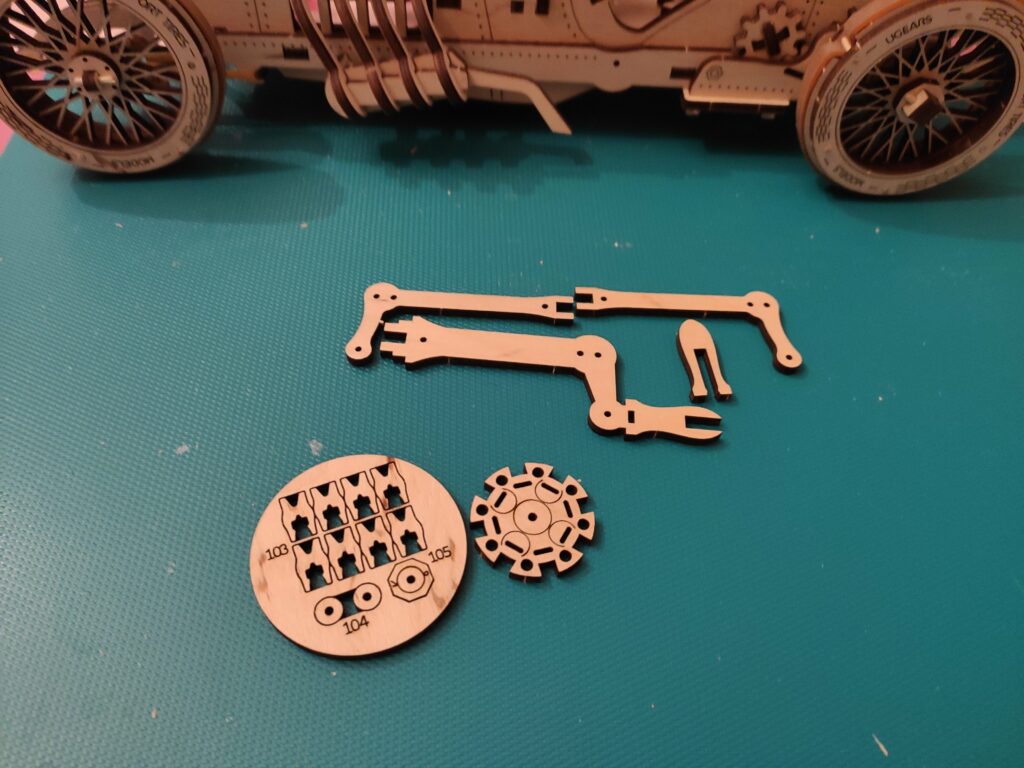 une petite auto en bois pour finir l’année, dans le descriptif c’est indiqué « à partir de huit ans » je doute qu’un enfant puisse la réaliser tout seul sans l’aide d’un adulte, bon apres tout …., le montage n’est pas compliqué mais reclame beaucoup de soins et de patience , contrairement aux modèle de chez Ugears celui-ci à besoin d’un peu de colle.